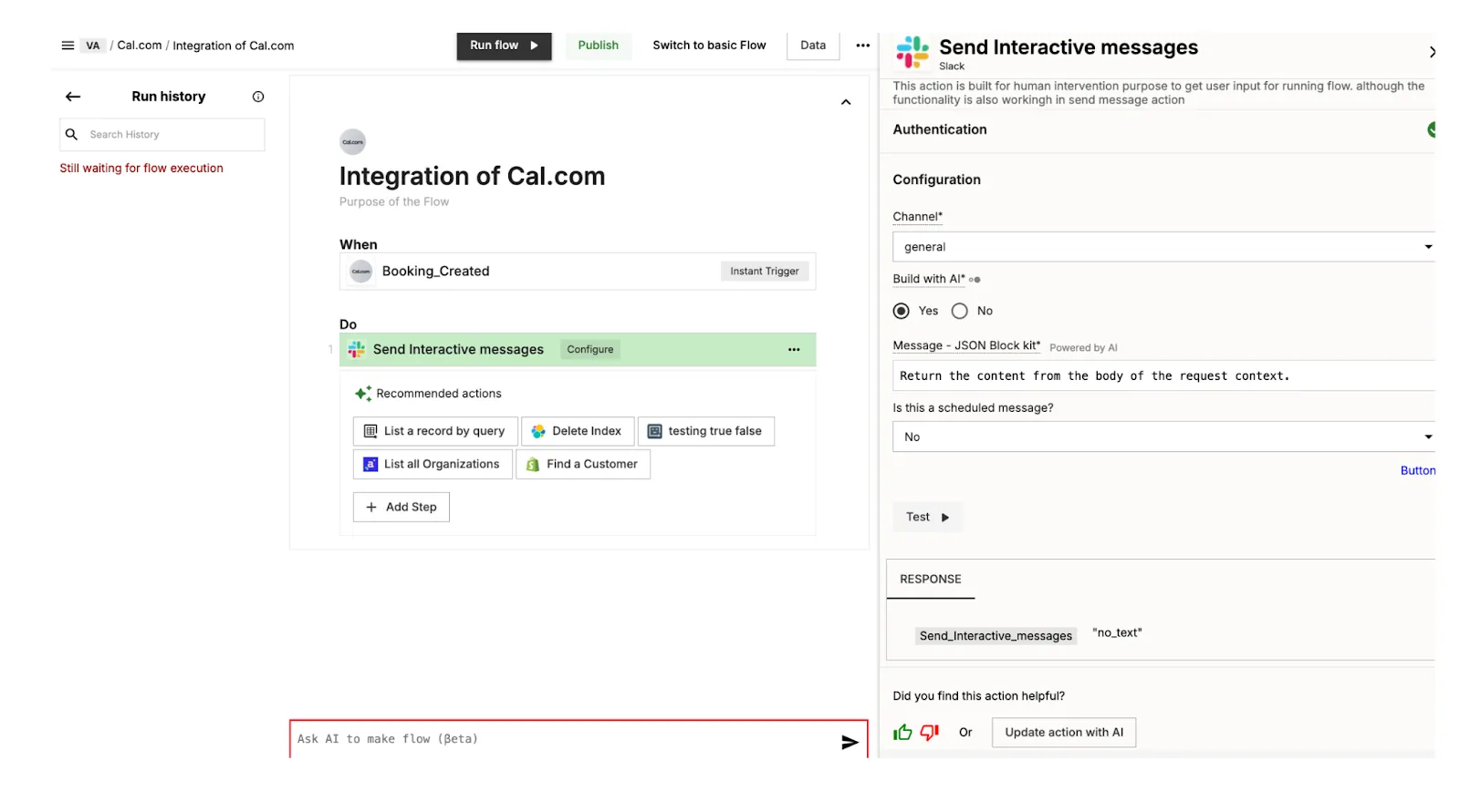 Once tested, publish the workflow, and it will run automatically whenever a meeting is created in Cal.com.