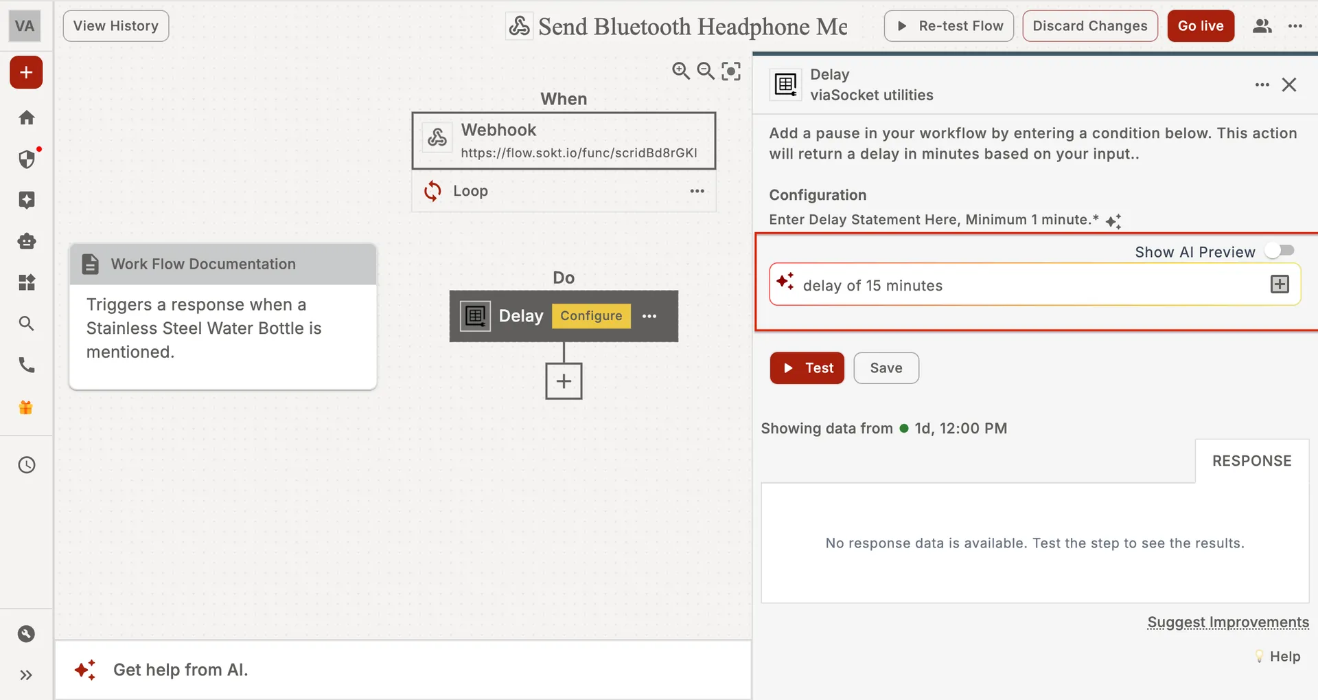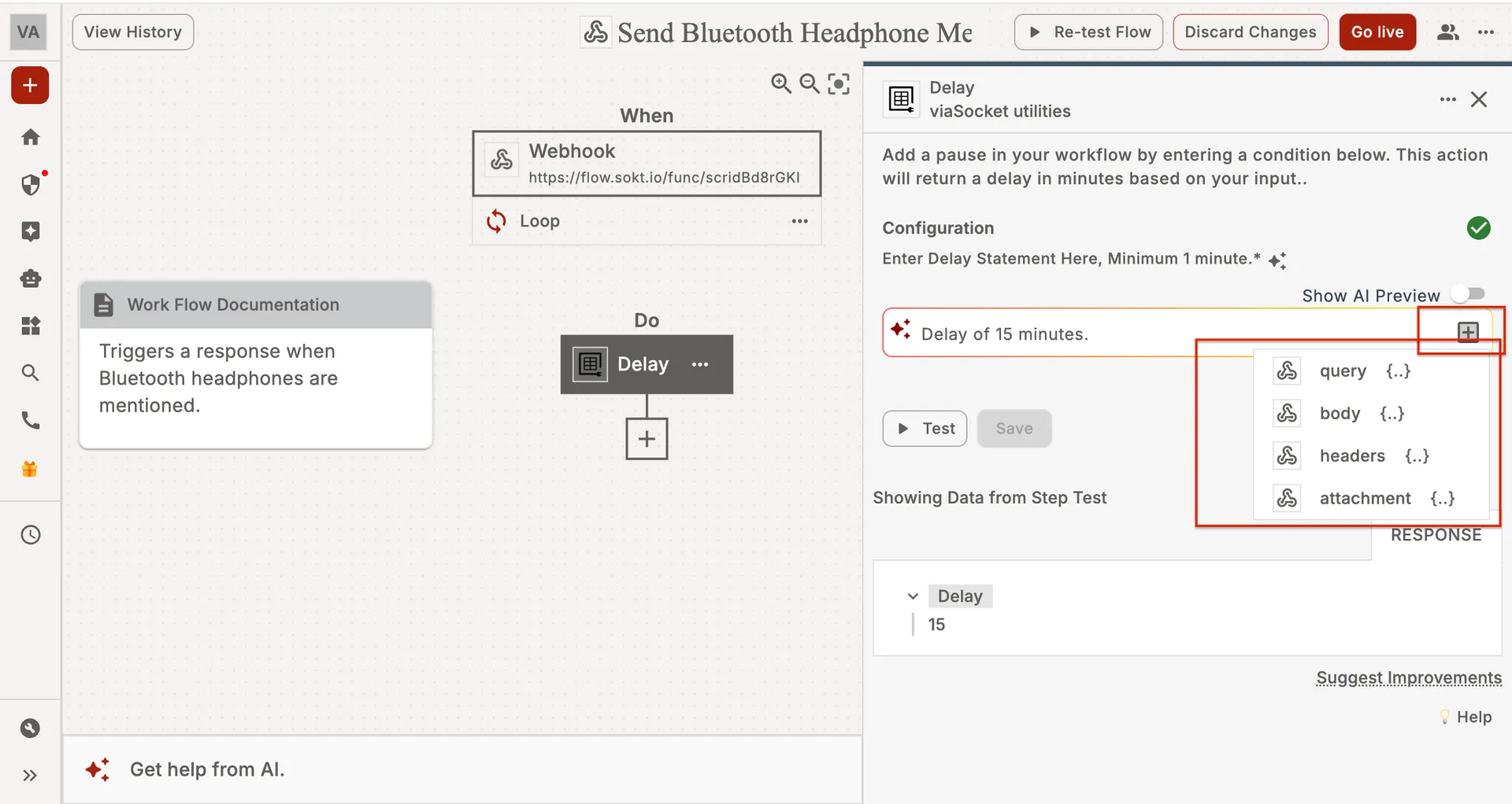 Delay is an in-built viaSocket tool that lets you put your workflow into a controlled pause before the next step executes.